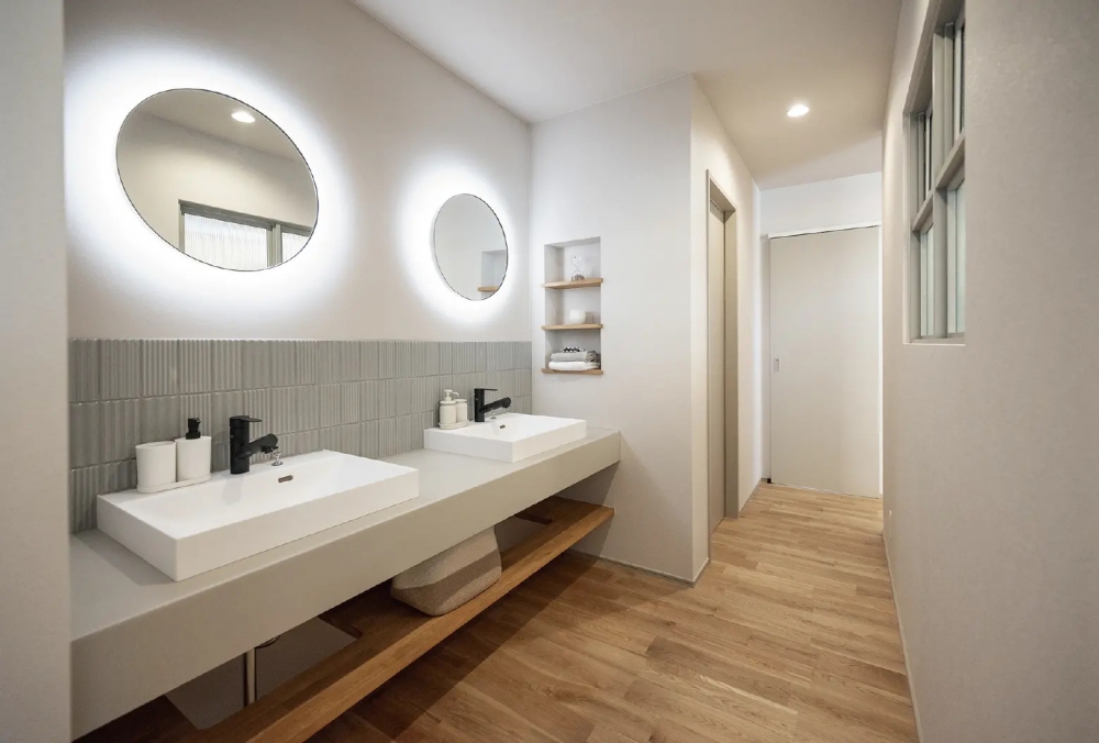 洗面ボウルを2ヶ所設置した、間接照明の鏡がアクセントの洗面室。朝の慌ただしい時間もゆとりを持って準備をできます。