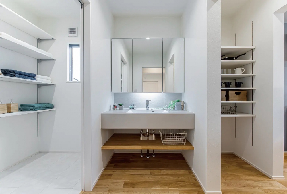 スペースを有効活用しながらもデザイン性を両立させた洗面室。収納スペースを洗面台の左右にしっかりと確保しています。