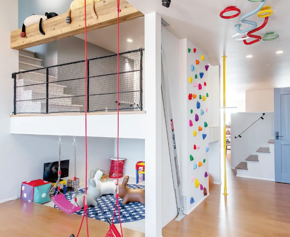 1階の居室天井高2.75m&大きな窓を多数採用した開放的な空間設計をベースに、玄関すぐの手洗い場や抗菌・除菌素材を使った部屋、趣味や収納に大活躍の2つのロフト&2つのスキップ収納、仕事や趣味に使える複数のユーティリティスペース、住まいがアスレチックに変身するボルダリング&カラフルなうんてい・複数のハンモック、バーベキューが楽しめるウッドデッキ等、住まいを楽しく快適に過ごすためのアイデア満載のモデルハウスです。