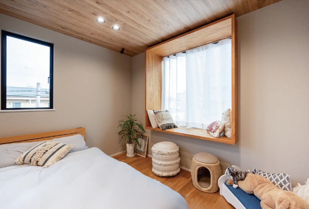 腰をかけることができる窓ベンチが印象的な主寝室。入口側にはダイニングテーブルセットがおけるスペースもあり、マスタールームに相応しい広さを備えています。