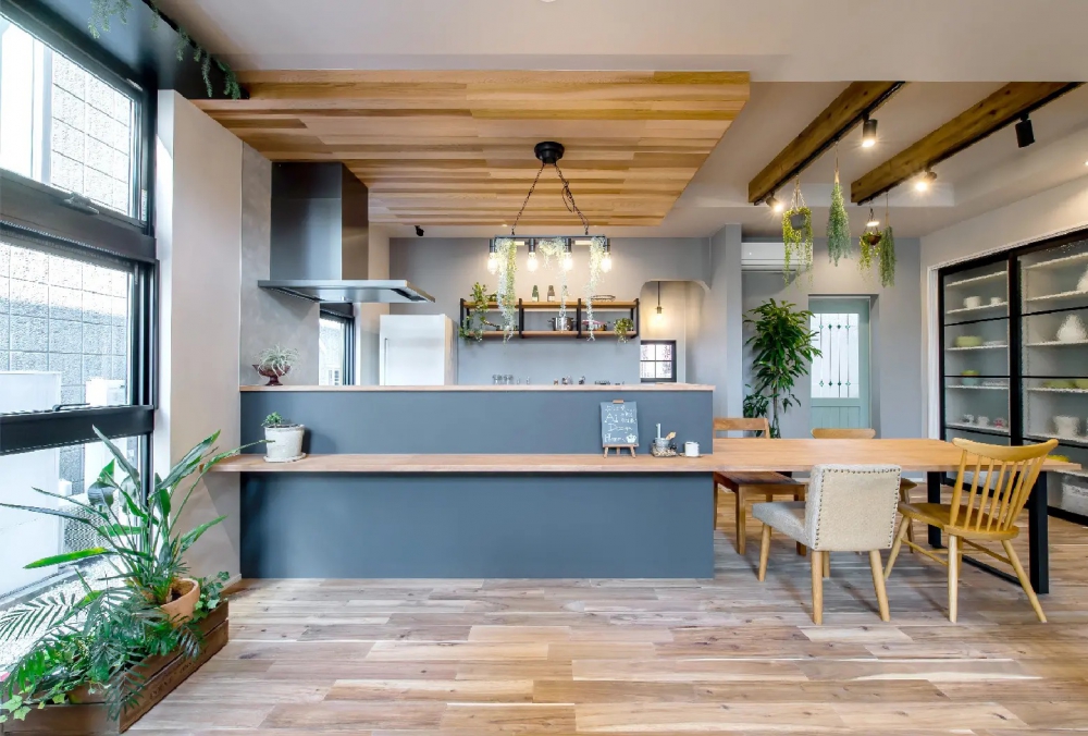 木とホワイトをベースにアクセントでブルーグレーを採用した、ナチュラル&モダンなダイニングキッチン。壁と一体化したキッチン収納や、カウンターとダイニングテーブルが一体型の造作カウンターなど、家づくりのアイディアが満載です。