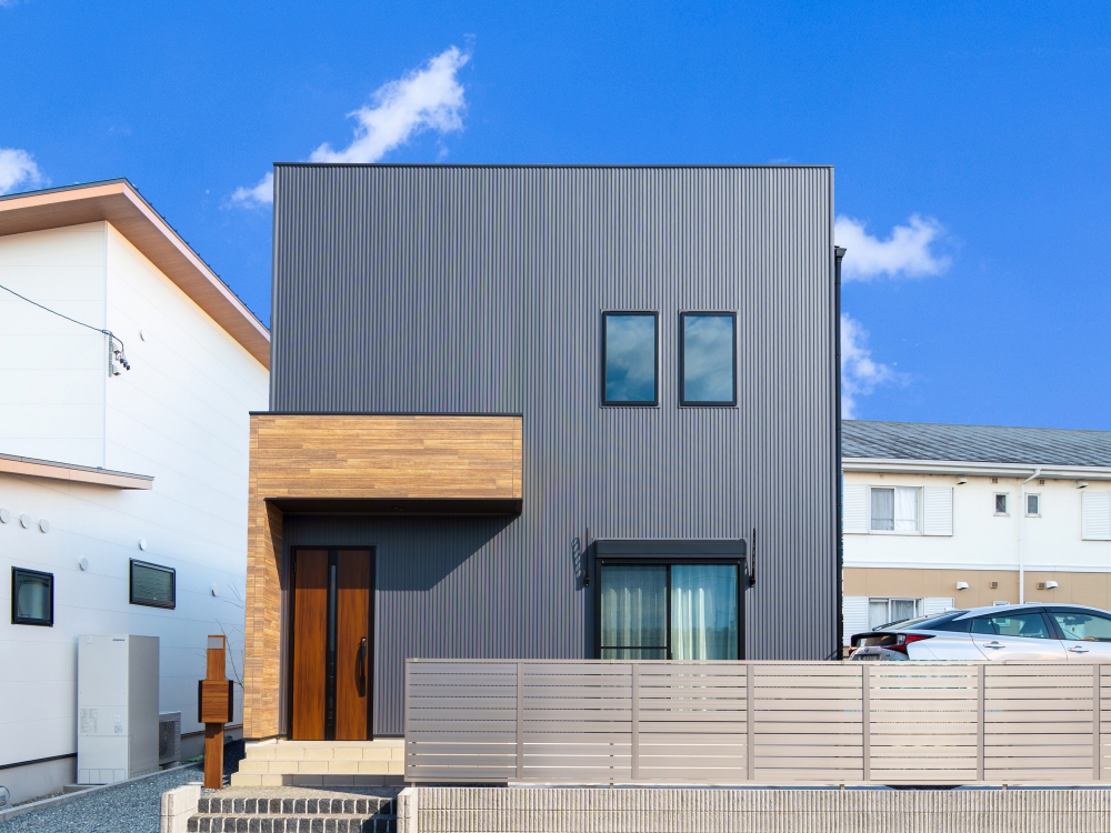 ハコ型のシンプルなフォルムに、ガルバリウム鋼板と木目調の外壁を組み合わせた洗練されたデザイン。