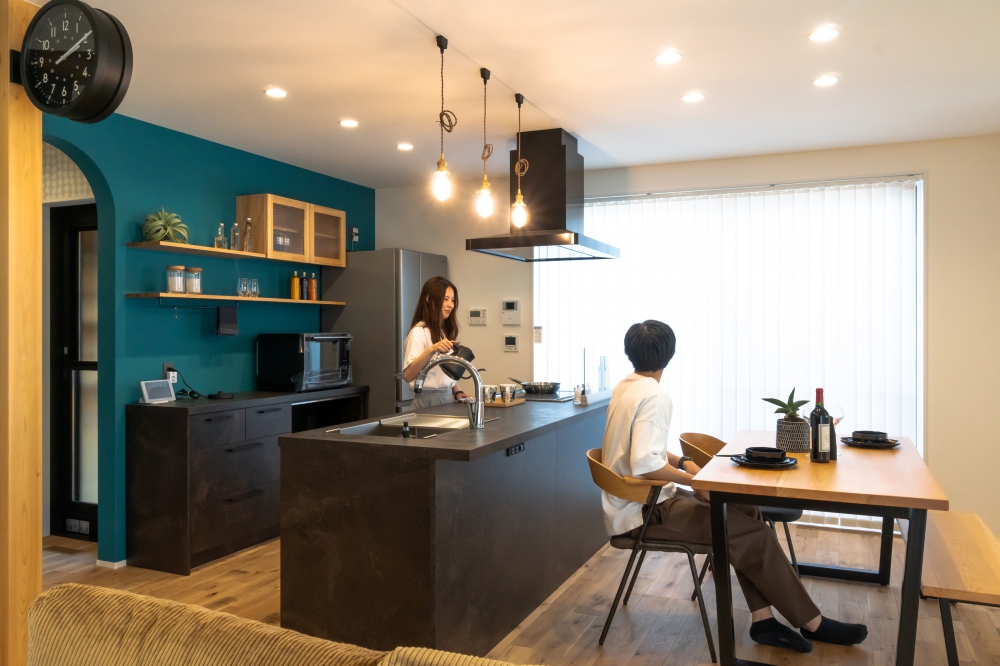 エメラルドグリーンのアクセントクロスとグレーのカウンターを組み合わせたアイランドキッチン。
