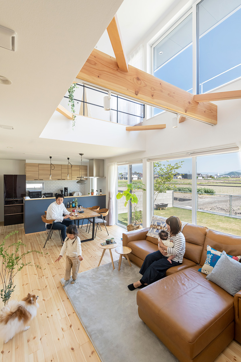 吹き抜けと見せ梁が映える、開放感あふれる住まい