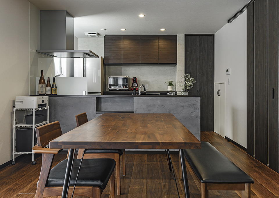 「自然のものから作られることで独特な雰囲気を持つフランス漆喰を使いたい」というご希望をお持ちだったAさんご夫妻は、リビングの壁のほか、抗菌力があり、水を弾いて湿気防止にもなるという特徴を生かしてキッチンにも用いることに。モダンな雰囲気のお住まいになりました。