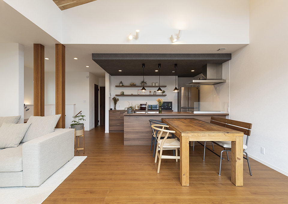 フラットにつながる平屋の縦空間を活用して、開放的な空間提案を実現。