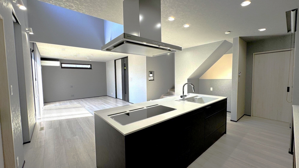 リビングスペースと調和した優しい木のパネルが美しい最新のアイランドキッチンは、ステンレス天板でレストランの様な高級感があり、毎日の家事を楽しくしてくれます。