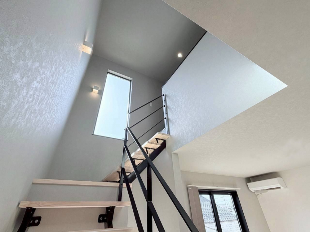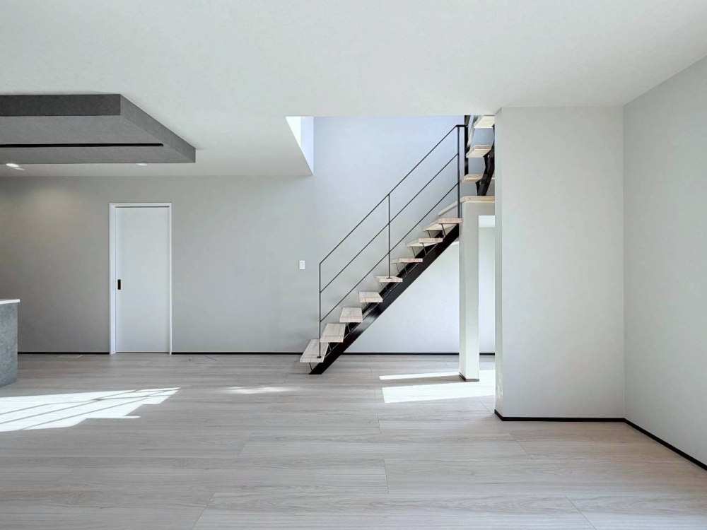 スケルトン階段が空間に奥行きを与え、ミニマルでありながら印象的な住まいに。