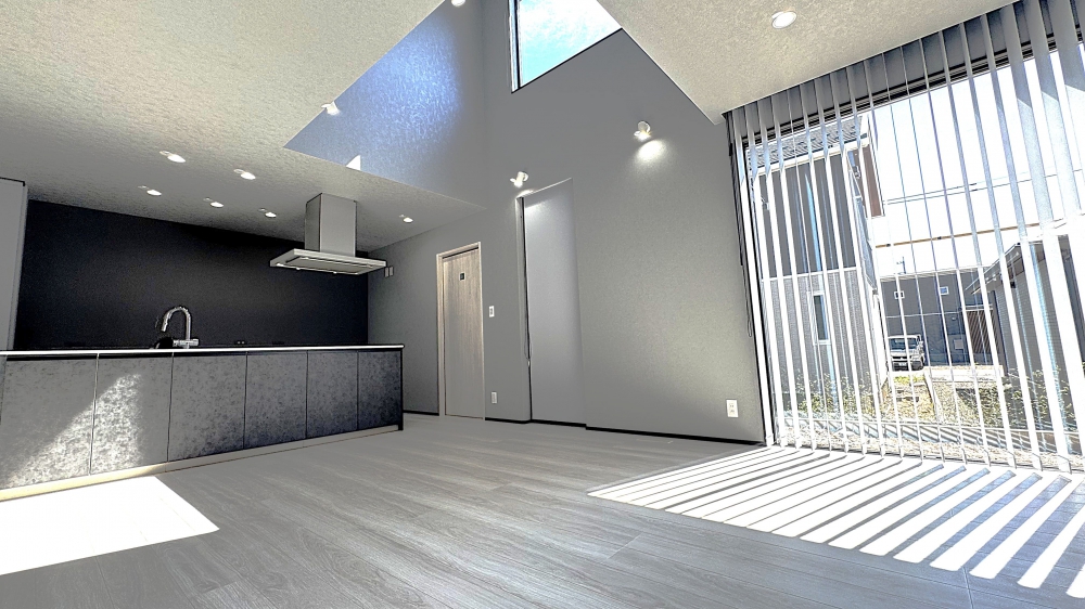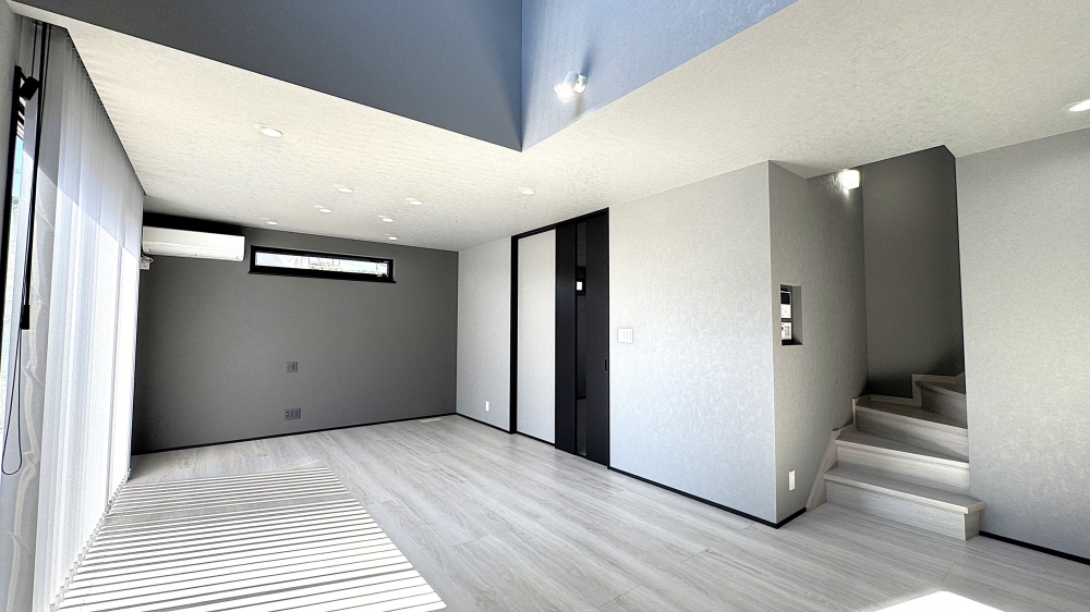 リビングは、無垢材の床がやさしく足元を包み込み、吹き抜けと折り下げ天井が空間に広がりとリズムをもたらす、贅沢で心地よい空間。洗練されたグレートーンでまとめられたインテリアは、モダンでありながらあたたかさも感じられ、まさに“くつろぎのラウンジ”と呼ぶにふさわしい仕上がりです。