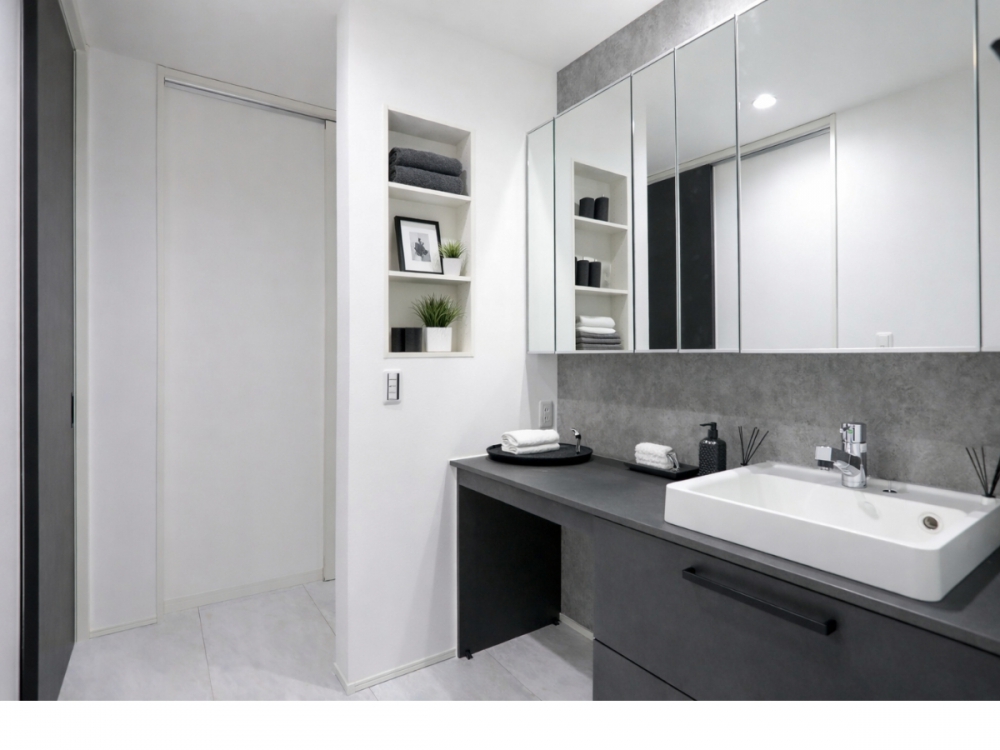幅広の洗面台は、座って作業やお化粧が出来るオープンスペースを設けました。