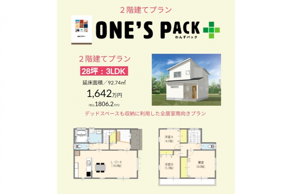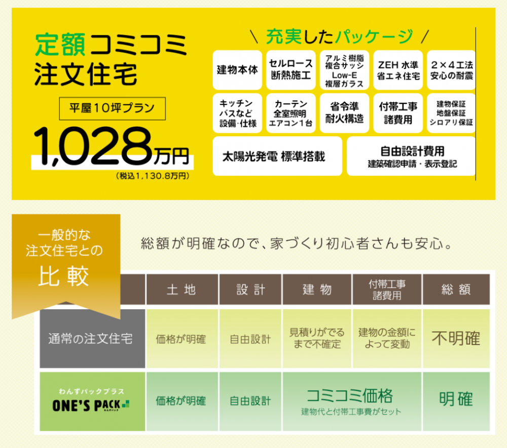 「わんずパック+」は地震に強い2×4(ツーバイフォー)工法を標準施工とし、建坪で総額がわかる定額制のパッケージプランです。