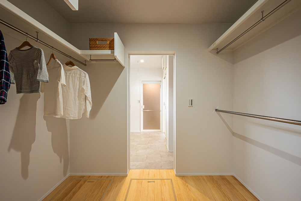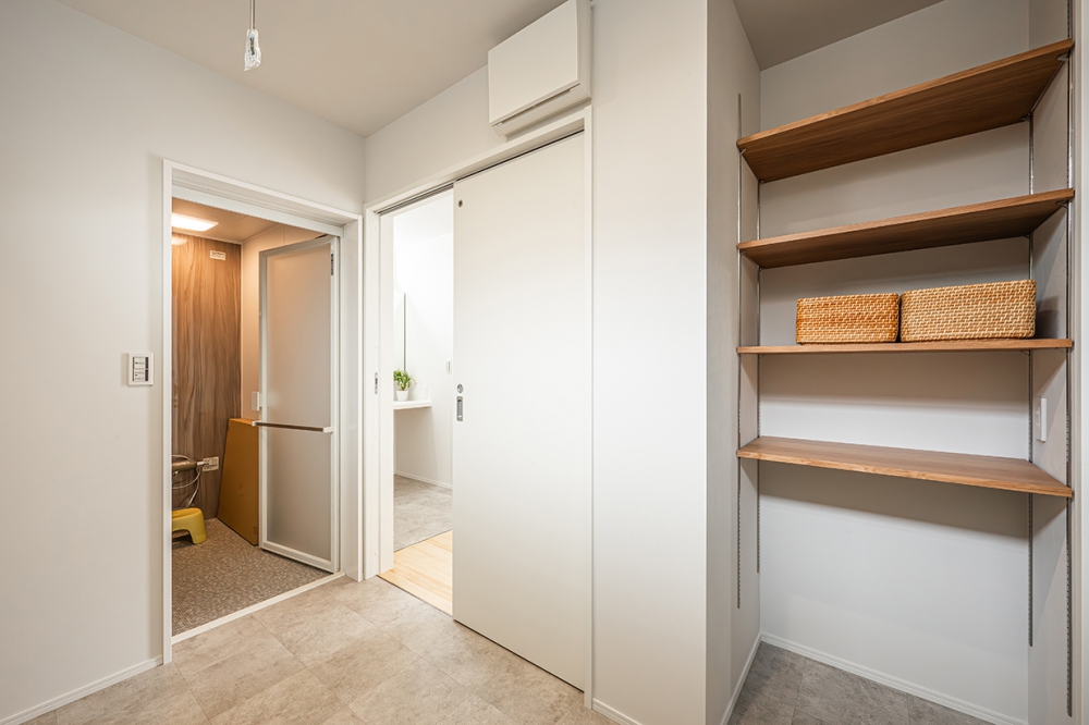 玄関は、広々とシンプルなゲスト用と生活動線を配慮した機能性たっぷりの家族用を分け、いつでもスッキリな状態をキープできるので、急な来客でも安心してゲストを迎えることができます。