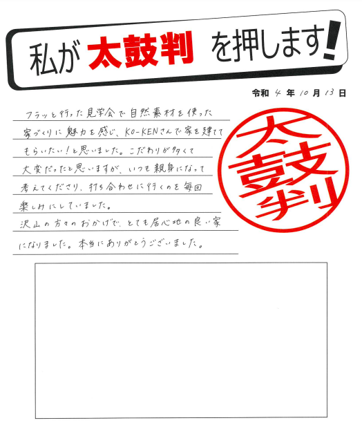 フラッと行った見学会で自然素材を使った家づくりに魅力を感じ、KO-KEN さんで家を建ててもらいたい!と思いました。