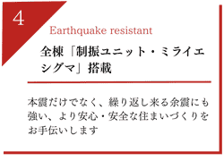 安心・安全な暮らしを支える「耐震設計」、お客様満足度を第一に考えた「ロープライス&ハイクオリティ」、居心地と暮らしやすさを兼ね備えた「機能・デザインにこだわった住宅設計」、一年を通じて快適な住空間を創造する「冬暖かく夏涼しい」、経験豊富な職人による「家造りは職人の技術力」。