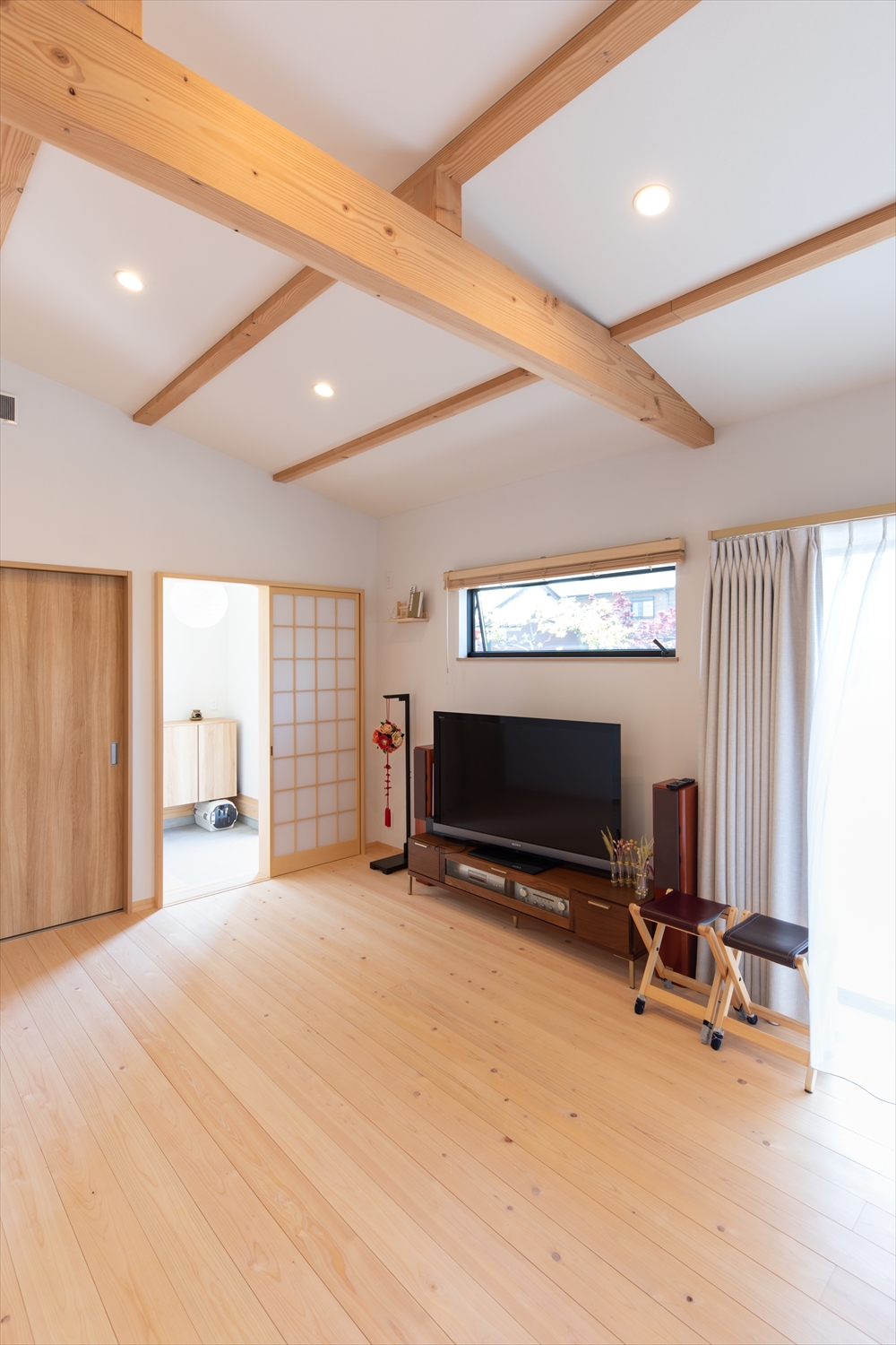 存在感のある梁が木のぬくもりを感じさせてくれる平屋です。全館空調システム搭載でお留守番中の猫ちゃんも安心。カーテンレールの上にはキャットステップを設置しました。これから棚を追加して猫ちゃんが喜ぶ空間づくりをしていく予定です。