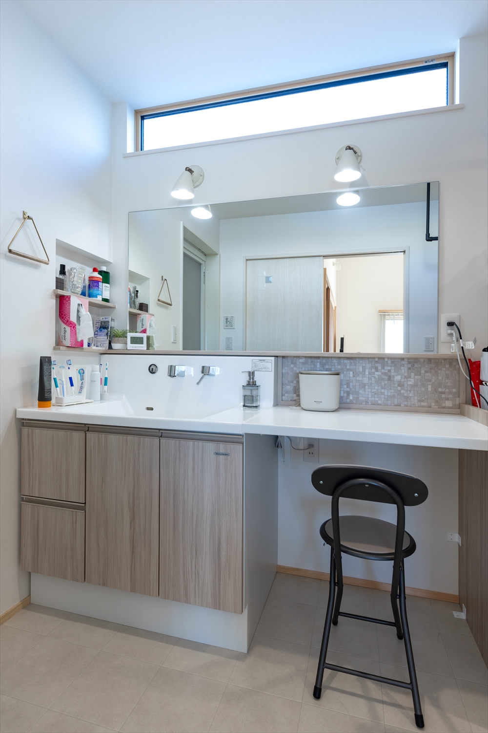 1、 造作洗面台・・・大きい鏡とお気に入りのタイルの天板