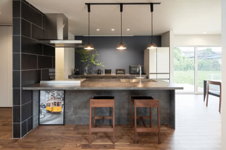 キッチンはブラックの大判タイルやグレーカラーが魅力的で、ダイニングはあえてテレビを遠ざけ、食事の時間は家族でゆっくり会話を楽しんでいるとのこと。