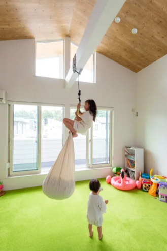 子供部屋は部屋全体を明るくする窓や鮮やかな黄緑のカーペット・天井木目など、デザイン性とのびのび空間を心がけました。