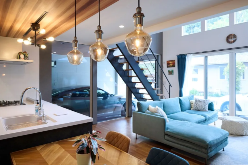 開放感溢れる吹き抜けは木目の天井とアイアンの照明がアクセントに。