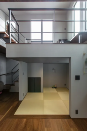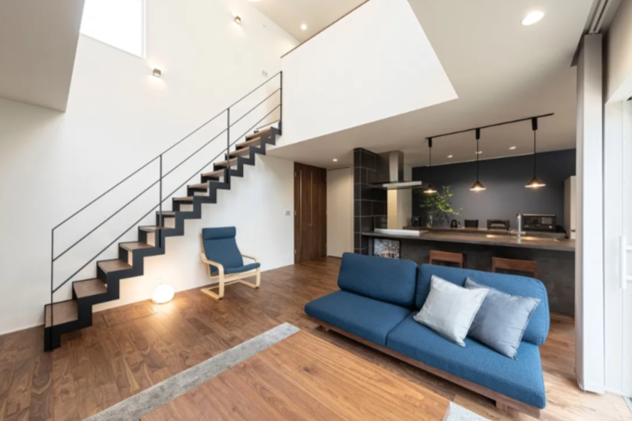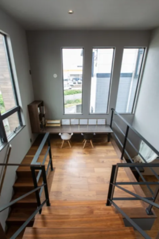 アイアンの手すりで開放的なスキップフロアではお子様がお絵かきや折り紙を楽しみ空間を遮らずどこにいても家族がつながり、笑顔あふれる住まいが完成しました。