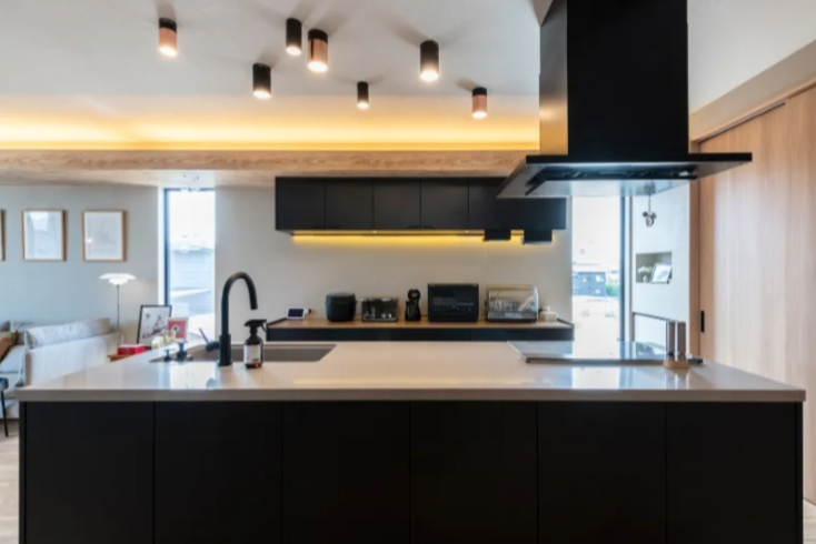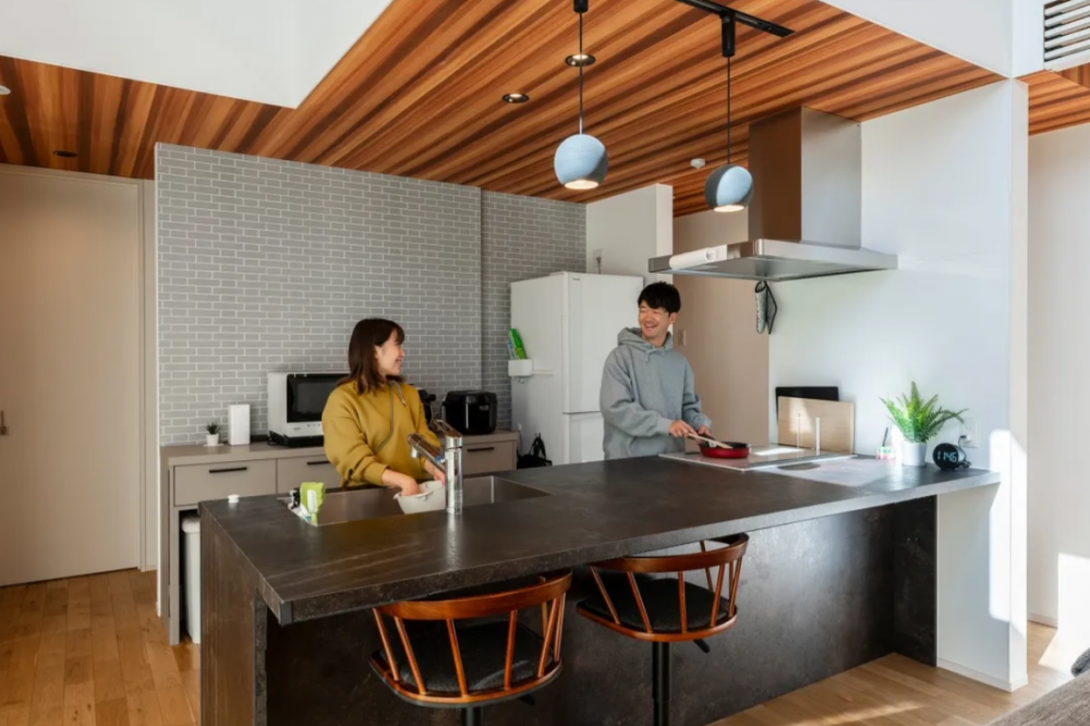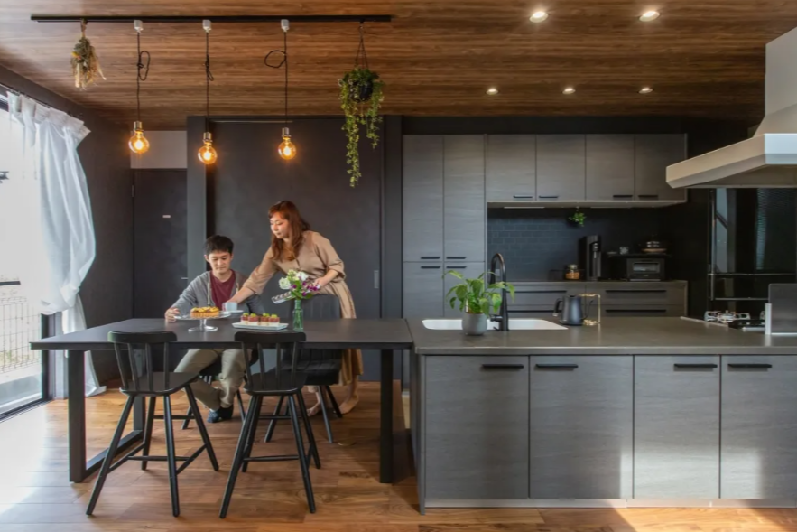 キッチンはブラックの大判タイルやグレーカラーが魅力的で、ダイニングはあえてテレビを遠ざけ、食事の時間は家族でゆっくり会話を楽しんでいるとのこと。
