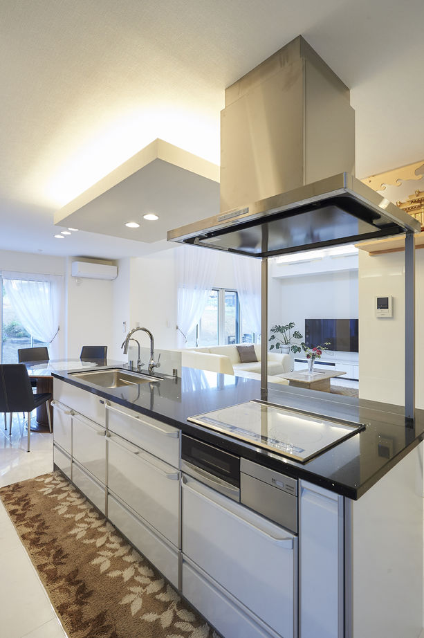 奥さまがこだわりのキッチンはブラックの色調が重厚感たっぷり。洗面所はどこからもアクセスが良く、2人並べる広さもこだわりの一つ。