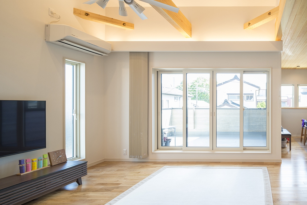 リビングは、梁の見える勾配天井に高窓を取り入れ、