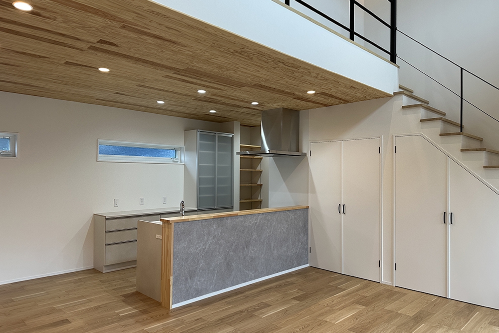 1階から、通常の半分程度の階段を上がると、リビングとダイニングキッチンがワンフロアに広がります。