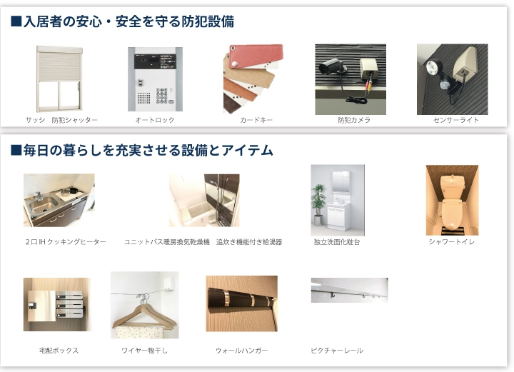 入居者の日々の生活を第一に考え、入居者のニーズに合わせた仕様と設備を選定し、標準仕様としています。駅徒歩10分以内、防犯カメラ、オートロック、防犯センサー、インターネット完備など安心・安全性につながる仕様です。そのため、様々な方が入居でき、空室リスクの低下・オーナー様の収益につながります。