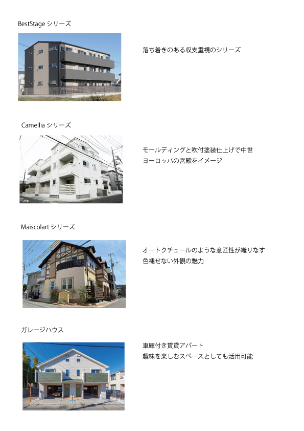 木造三階建て共同住宅で長年愛されてきたBestStageのノウハウが詰まったBestStageシリーズ、中世ヨーロッパに建つ白壁の宮殿をイメージした、白椿を模したCamelliaシリーズ、フランス・アルザス地方のコルマールに見られる古き良き文化が感じられる美しい街並みをモチーフにし、国産の左官材を用いてデザインしたMaiscolartシリーズがあります。また、最新のシリーズとして、こだわりの愛車と暮らしたい入居者が待ち焦がれている車庫付き賃貸アパート「ガレージハウス」もございます。