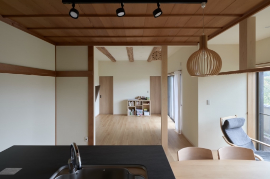 長年親しんだ実家を、快適に暮らせる理想の空間へ。LDKは可能な限り広さを確保し、キッチンやニッチ、外構に至るまで素材の色味や質感にこだわりました。生活空間をほどよく分けつつ、造作扉や視線の抜けなどで家族の存在をさりげなく感じられるように。互いを尊重し、つかず離れずの心地よい距離感で暮らせる住まいです。
