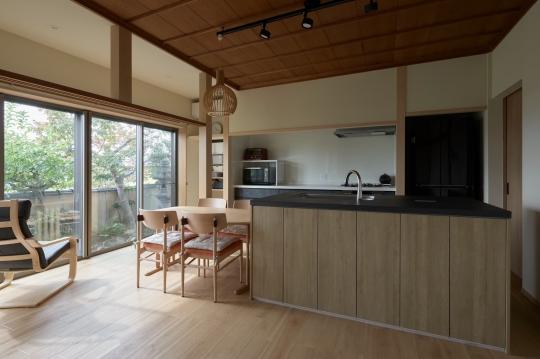 ご実家の離れをリノベーションした施工事例。既存の建物の竿縁天井や柱、梁を活かしつつ、現代的なデザインを散りばめ、調和のとれた和モダンな空間に仕上がっている。開放的な明るいLDKからは庭の草木を見渡せ、四季の移ろいを感じられるお住まいとなった。