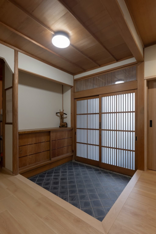 玄関も既存のタイルやフローリングを活かしつつ、味わいを出した。