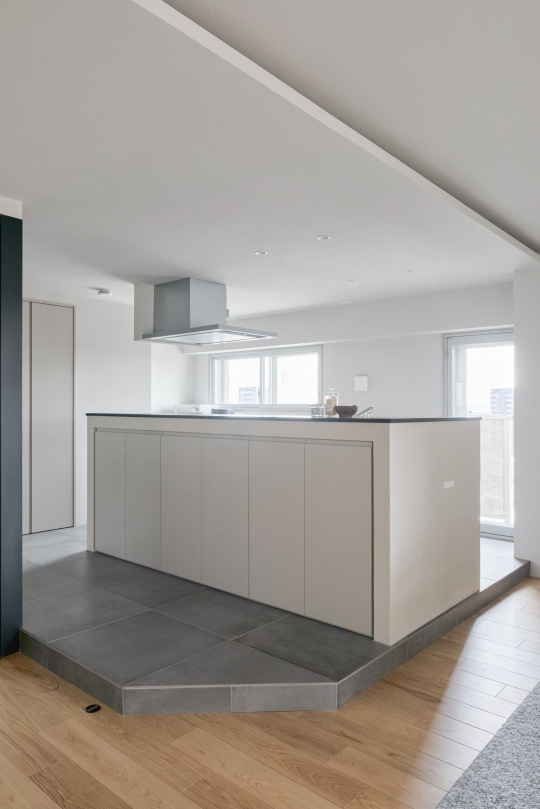 キッチンとダイニングは直接的な仕切りはつくらず、ちょっとした段差を設けることでゾーニングしています。
