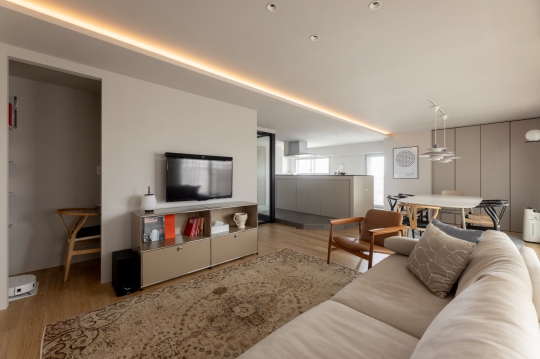 広々としたLDKとマンション最上階の勾配天井を活かし、豊富な収納を備えた空間へとリノベーション。リビングにはお気に入りの家具やインテリアを飾り、穏やかな時間が流れる居心地良いお住まいとなりました。R壁の曲線美が、モダン×ホテルライクな雰囲気を引き立てています。
