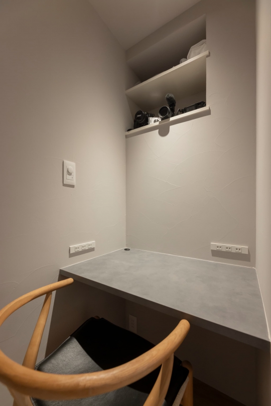 家具や造作、建具の色も床材と同系色にまとめ、統一感を出している。壁面にはワークスペースを造作し、家事効率を向上させている。