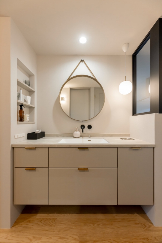 質感にこだわった天板にはコーリアンを採用。ダストシュートでゴミ箱を隠し、すっきりとした印象に。下部には浮遊感のある造作収納を計画しました。ペンダントライトは施主様こだわりのルイスポールセン。側面のニッチには、歯ブラシや小物置きとして活躍します。