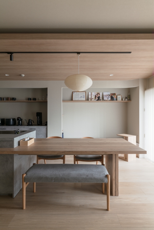 ライフスタイルの変化に合わせ、1人でも2人でも、家族と一緒でも快適に過ごせる住まいへリノベーション。 LDKを中心に、仕様や色味を見直し、ナチュラルテイストに仕上げました。造作風のヌックやこだわりの収納スペースは、コストを抑えながらもデザインの統一感を大切にし、心地よい空間を実現しています。
