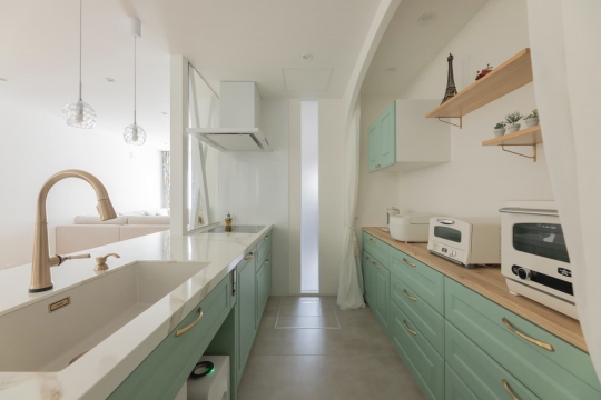 玄関を開け、真っ先に目に留まるのがLDKの中心に据えられたアイランドキッチンだ。ブルーグリーンに塗装されたアイランドキッチンは、ダイニングと一体型の天板がポイント。かわいらしい陶器の取っ手や、輸入風の水栓を取り付け、世界の一つだけのキッチンを演出した。