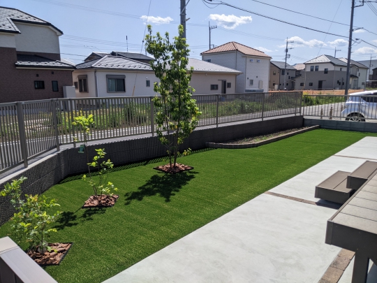 タイルデッキと人工芝のお庭は、目隠しフェンスと枕木材、植栽で道路からの視線をカット。