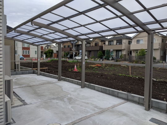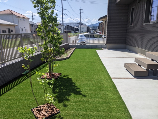 お庭のスペースは人工芝、車庫スペースは洗い出しコンクリートで仕上げました。
