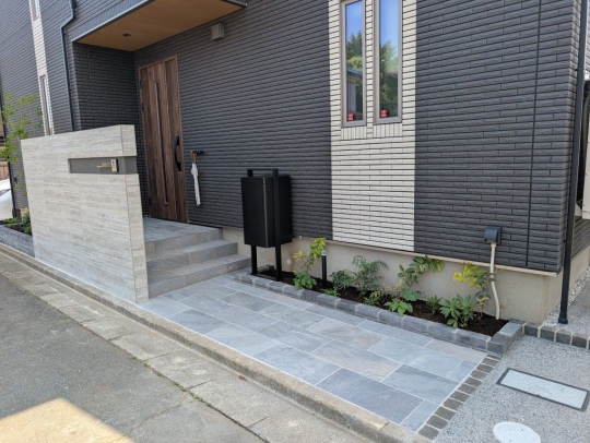 アプローチはタイルで仕上げ、洗練された外構になりました。
