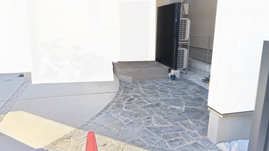 アプローチは自然石の乱形張り、土間との境界には同色のピンコロを設置しました。
