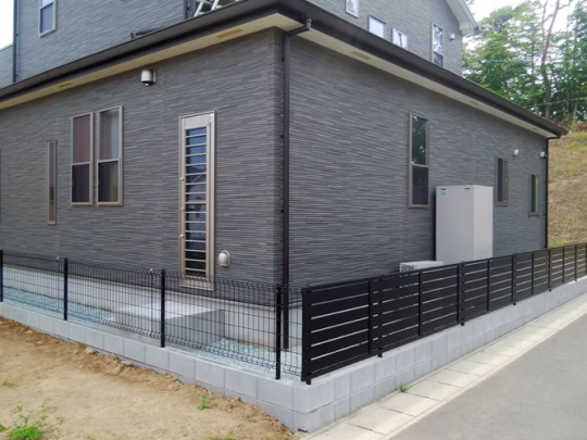 西側境界にコンクリートブロックを2段積み、メッシュフェンス(高さ80cm・長さ15m)を設置。