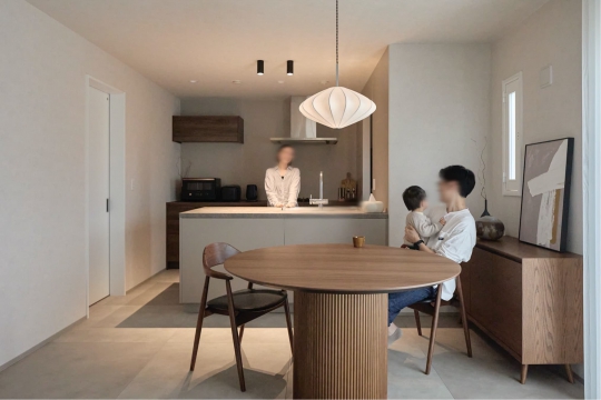 子育てをきっかけに住まいを見直したご家族が大切にしたのは、広さではなく、日々の暮らしが心地よく整うこと。こだわりを凝縮したキッチンが空間を彩り、LDK内に設けた畳スペースはふっと肩の力を抜き、ゆったり寛げる安らぎの場となりました。生活感を抑えた収納計画で住まいをすっきりと保ち、余白の美しさを感じる洗練された空間を創り出しています。