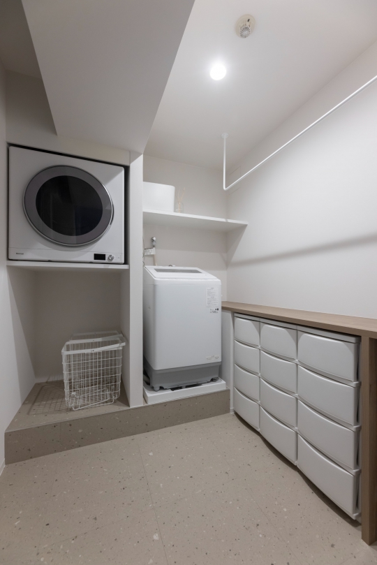 LDKの拡張により、凛とした美しさに魅了される新たな空間が誕生しました。水回りの移設で動線を改善し、同時に収納スペースも確保。特に洗面台の背面に設けたファミリークロークは、帰宅後すぐに荷物を収納できる便利な動線です。これにより、家族が集うLDKでの団欒の時間を心ゆくまで楽しめます。