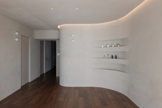 グレージュ・木・タイルを基調とした低彩度のコーディネートで、静けさと奥行きを感じられる住まい。塗装仕上げの柔らかなR壁が自然光や間接照明によって陰影を生み出し、部屋全体を優しく包み込むような雰囲気をつくり出しています。各所に設けた隠す収納で生活感を抑えつつ、素材や光の表情を心ゆくまで楽しめる空間です。