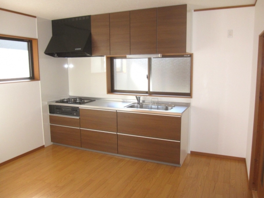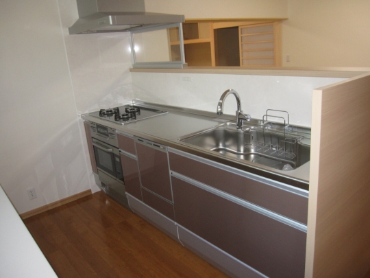 吊棚付のI型2550のシステムキッチンです。収納力が高く、落ち着きのあるデザインです。窓付建具は、廊下まで明るくしてくれます。