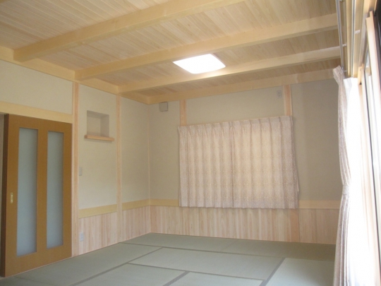 1、居間の天井・腰壁は桧羽目板、天井は化粧梁を使用し木の香りが癒しを与えます。