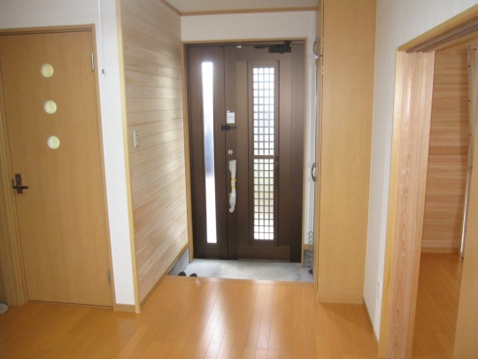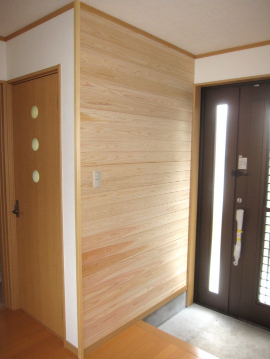 桧の羽目板を随所に使用しました。家の中に漂う桧の香りが心を癒してくれます。トイレ建具のデザイン窓もかわいいです。